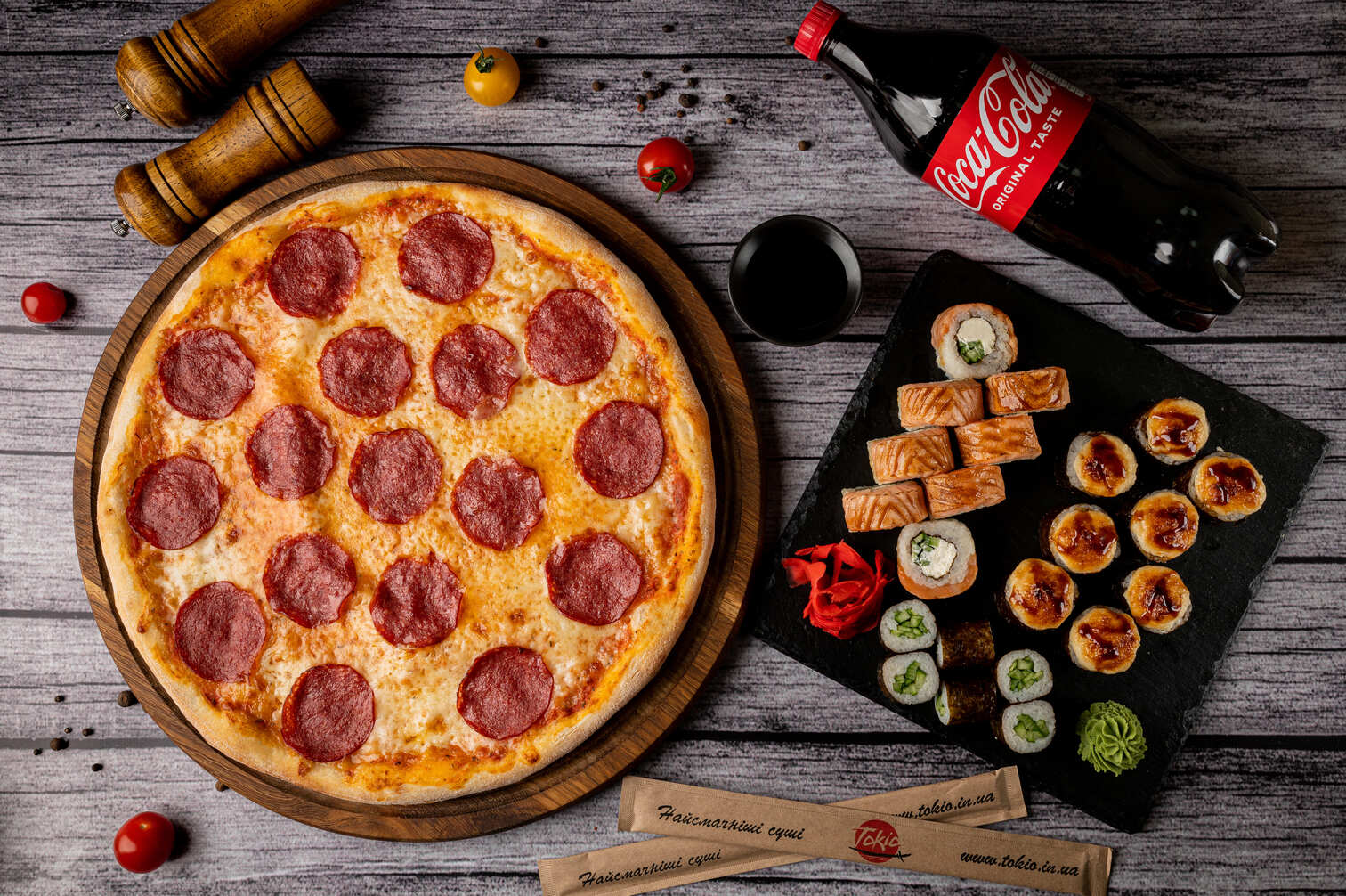 «Ми дбаємо про якість і пропонуємо різноманітне меню з популярними японськими та італійськими стравами. Улюблена піца та суші зі швидкою доставкою до вас додому або у офіс».