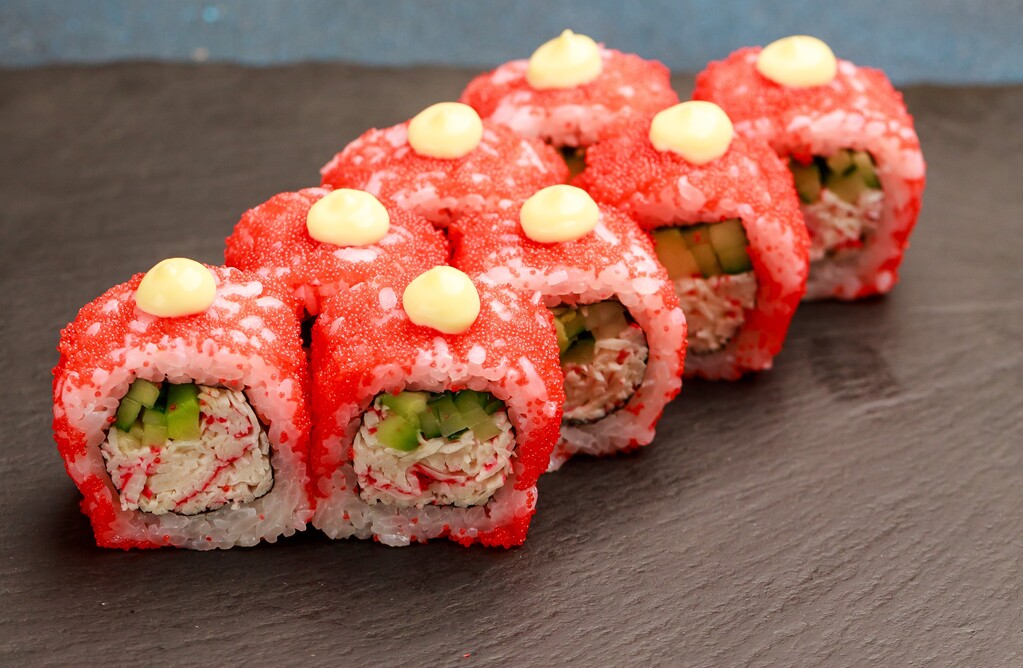 Каліфорнія — це рол, який виділяється своїм яскравим виглядом і незвичним поєднанням смаків. У класичному варіанті до складу входять м’ясо краба чи сурімі, авокадо, огірок і ікра тобіко, яка додає особливу текстуру.