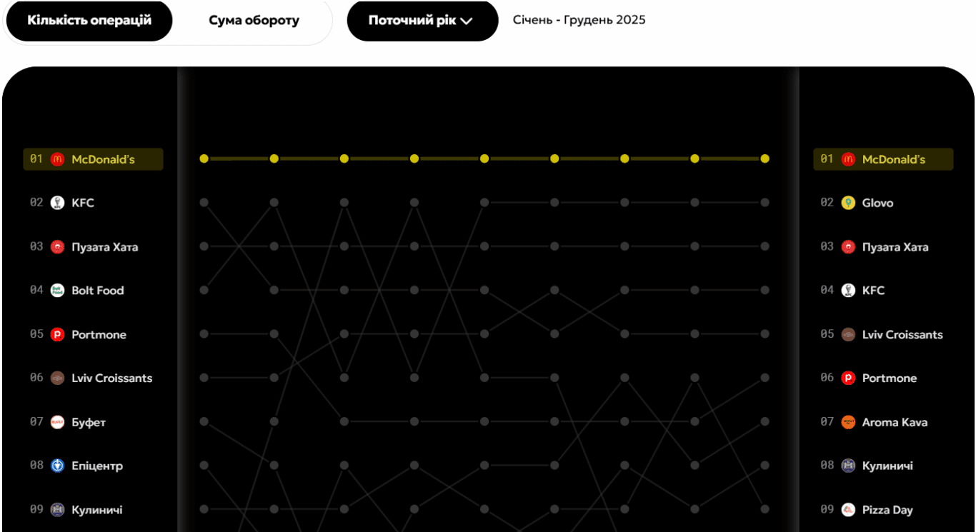 Дашборд від Monobank показує, що серед лідерів продажів — McDonald’s займає перше місце за кількістю чекових операцій. Саме ця мережа закладів швидкого харчування є найчастішим постачальником замовлень для українських споживаяів.