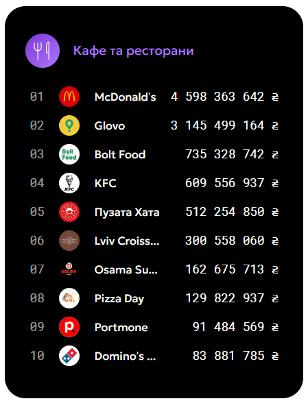 Або більше ніж 10,38 млрд. гривень продажів протягом 9 місяців 2025 року від «десятки» лідерів у категорії «Кафе та ресторани».