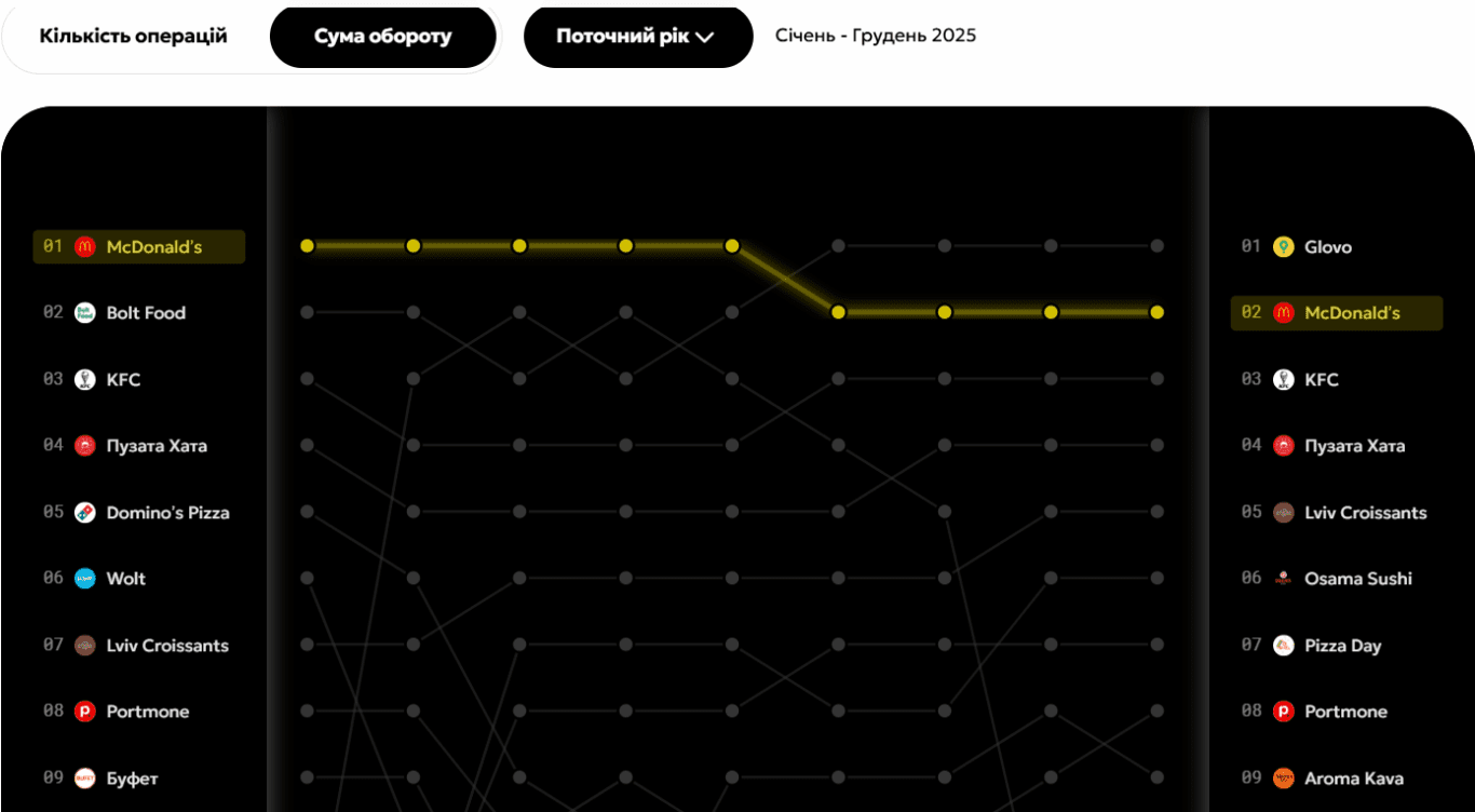 Дашборд від Monobank показує, що серед лідерів продажів — McDonald’s займає перше місце за кількістю чекових операцій. Саме ця мережа закладів швидкого харчування є найчастішим постачальником замовлень для українських споживаяів.